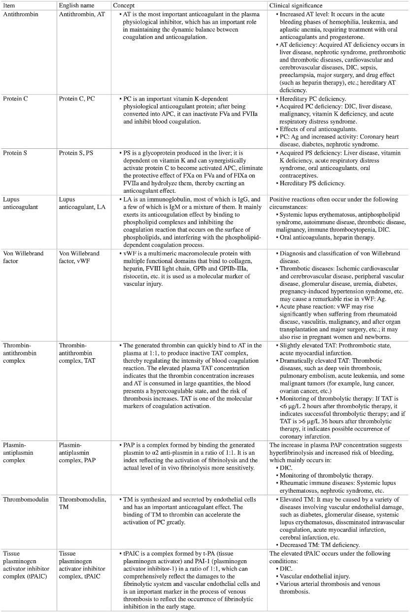 The routine four items are usually used for preoperative examination, but they cannot specifically determine the cause of thrombosis and bleeding in patients. With the continuous in-depth studies in the hemostasis and thrombosis, there is increasing demand for the testing of coagulation items. The existing six routine items cannot meet the clinical diagnosis of various thrombotic diseases, and there is an urgent need for new test items to supplement the existing testing menu. As a result, more and more new and valuable test indexes have been found (Table 5), which can escort the testing and diagnosis of thrombosis and hemostatic diseases.