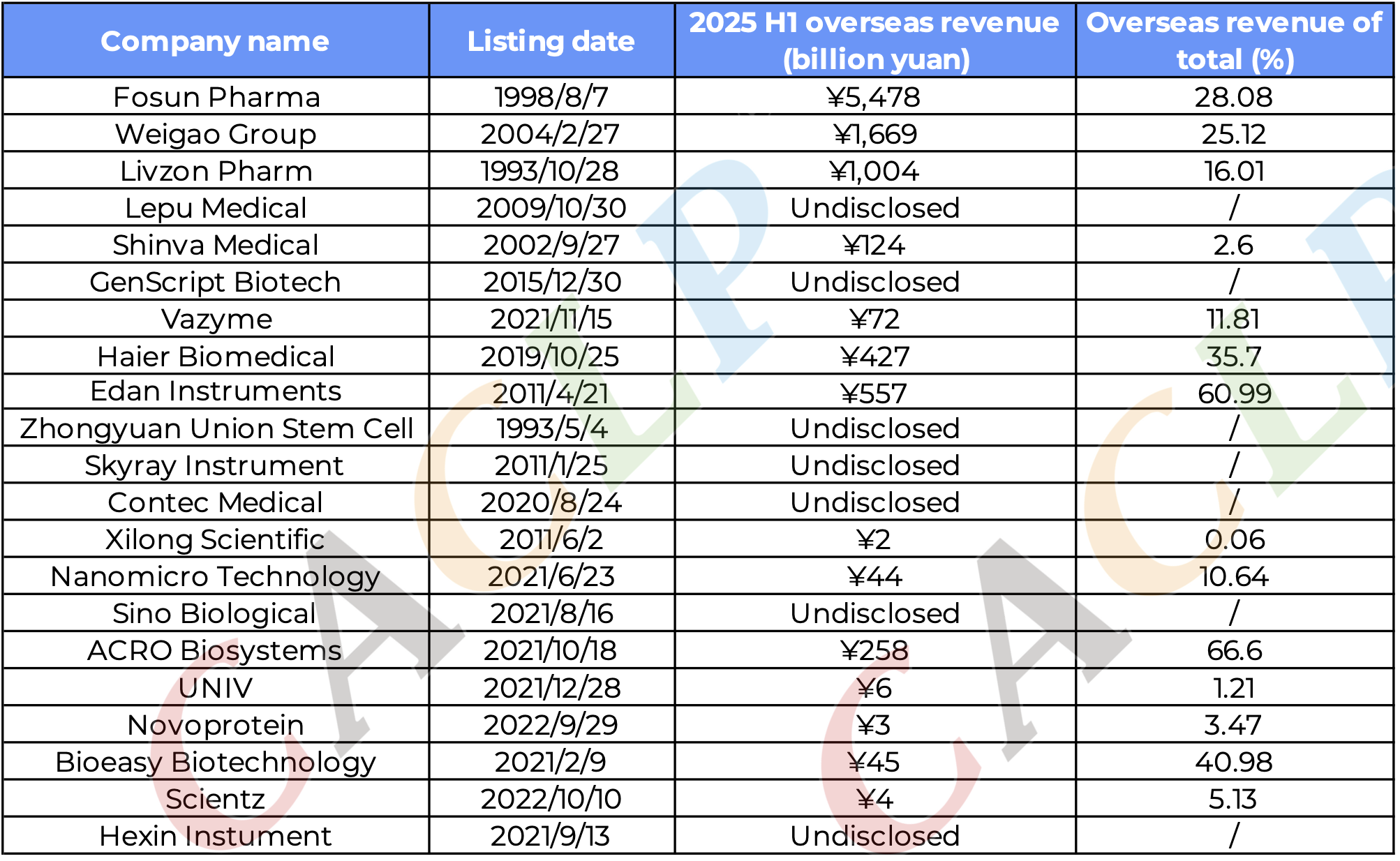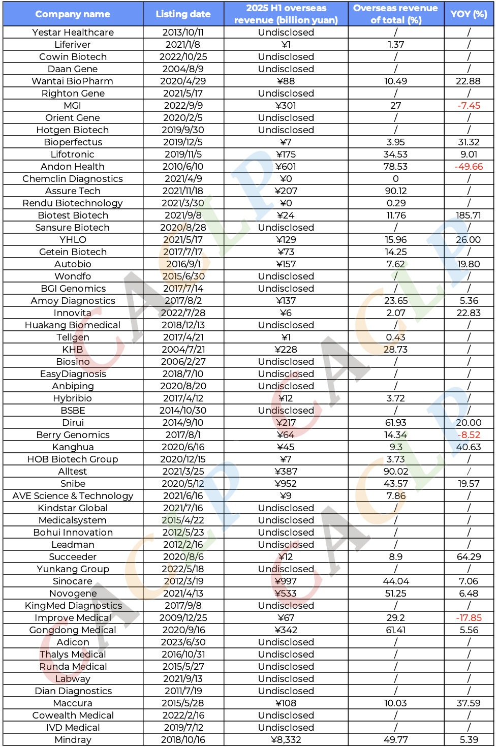 Table of Overseas Revenue for IVD-Related Companies in 2025 H1