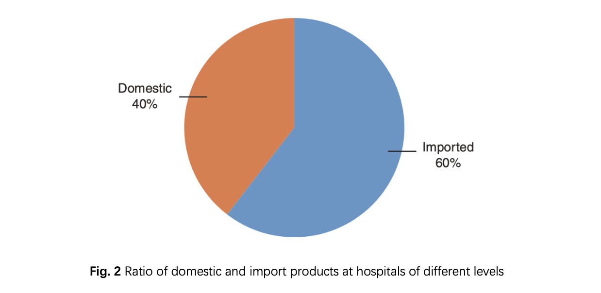According to the results of the basic research (Fig. 2), different medical institutions have selected different imported and domestic brand instruments: 38 domestic and 58 imported. The general trend is still dominated by imports; however, the gap between domestic and import ratios is gradually decreasing. Among the medical institutions studied (Fig. 3), it has been found that the proportion of domestic production in Grade III Level A hospitals is also on the rise. The reasons are the progress of domestic instruments and the enhanced marketing efforts brought about by the optimistic market, while the higher quality of operation of medical and nursing staff in Grade III Level A hospitals and the ability to control the quality.